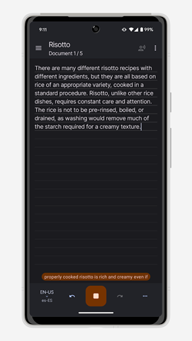 رابط کاربری برنامه SpeechTexter نیز بسیار ساده است و برای کار با آن تنها کافی است زبان مورد نظر خود را انتخاب کرده و سپس بر روی دکمه میکروفون ضربه بزنید و شروع به صحبت کنید. ضبط صدا با این برنامه هیچگونه محدودیت زمانی ندارد و به شما کمک میکند علاوه بر متنهای کوتاه بتوانید متنهای بلندی چون مقاله را نیز از طریق SpeechTexter بنویسید. این تبدیل گفتار به نوشتار فارسی آفلاین یکی از پرسرعتترین برنامه های تبدیل صوت به متن است که کاربران و طرفداران بسیاری دارد.