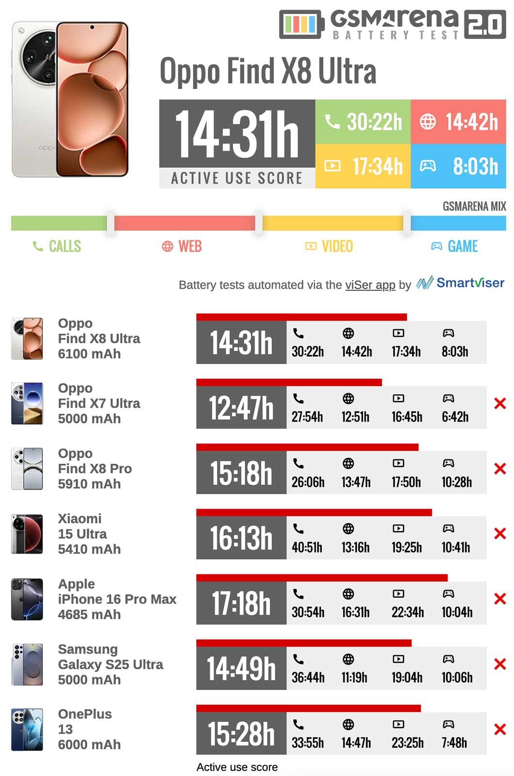 اما نکته جالب‌تر، مقایسه این اعداد با دیگر پرچم‌داران هم‌رده است؛ جایی که اوپو Find X8 Ultra با توجه به حجم باتری ۶۱۰۰ میلی‌آمپری خود در مقایسه با شیائومی ۱۵ اولترا یا حتی گلکسی اس ۲۵ اولترا با حجم باتری کمتر، عملکرد ضعیف‌تری داشته است. برای مقایسه می‌توانید وان پلاس ۱۳ را ببینید که با باتری ۶۰۰۰ میلی‌آمپری عملکرد بهتری نسبت به این دستگاه دارد.
