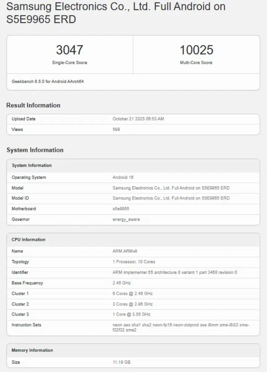 تنها ساعاتی پیش، امتیازات بهروزشده برای اگزینوس ۲۶۰۰ در پایگاه داده گیکبنچ ثبت شد. این امتیازات جدید کاهش قابلتوجهی را در قدرت پردازش خام نسبت به تستهای قبلی نشان میدهند. بهطور خاص، تراشه اگزینوس ۲۶۰۰ امتیاز چندهستهای ۱۰۰۲۵ و امتیاز تکهستهای ۳۰۴۷ را در گیکبنچ ثبت کرده است.