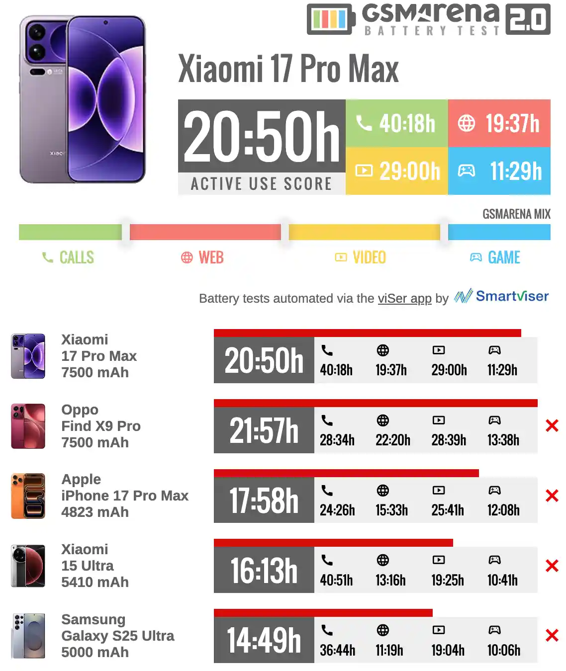اینفوگرافیک تست باتری شیائومی ۱۷ پرو مکس با امتیاز استفاده فعال ۲۰ ساعت و ۵۰ دقیقه و مقایسه آن با گوشیهایی مانند اوپو فایند X9 پرو و آیفون ۱۷ پرو مکس.