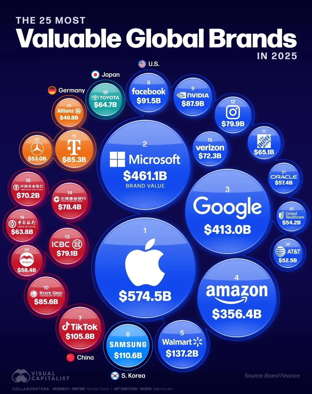 بر اساس این گزارش، در سال ۲۰۲۵ شرکت اپل با ارزشی معادل ۵۷۴.۵ میلیارد دلار همچنان جایگاه نخست را در اختیار دارد. پس از آن، مایکروسافت با ۴۶۱.۱ میلیارد دلار، گوگل با ۴۱۳.۰ میلیارد دلار و آمازون با ۳۵۶.۴ میلیارد دلار در رتبههای دوم تا چهارم قرار گرفتهاند. در رتبه پنجم، والمارت (Walmart) با ۱۳۷.۲ میلیارد دلار حضور دارد که نشاندهنده قدرت ماندگار این غول خردهفروشی در کنار ابرشرکتهای فناوری است.