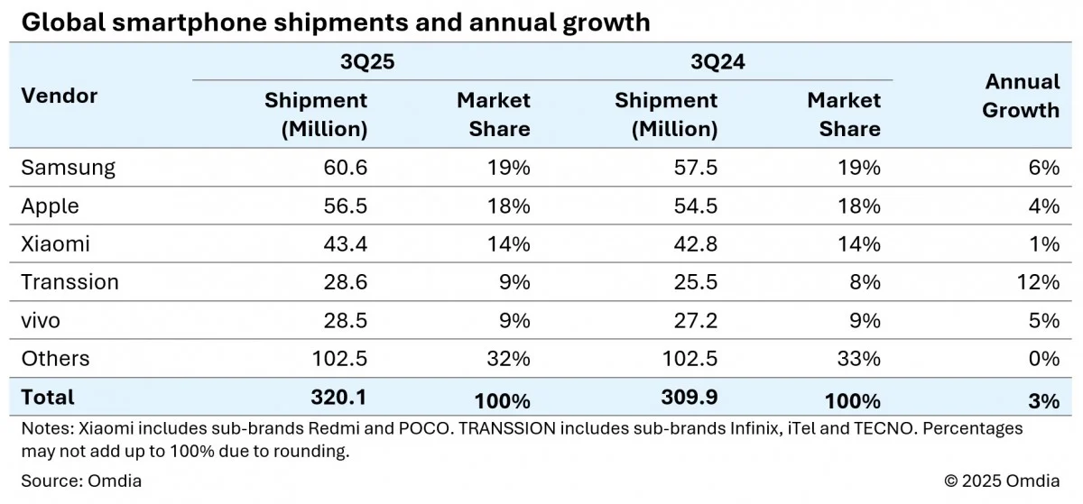 در مجموع، بازار جهانی گوشیهای هوشمند در سهماهه سوم سال ۳۲۰.۱ میلیون دستگاه عرضه کرده که نسبت به سال گذشته ۳ درصد افزایش را نشان میدهد. عرضهها در آمریکای شمالی و چین کاهش یافته، اما در مناطق آسیا-اقیانوسیه، خاورمیانه و آفریقا رشد چشمگیری داشتهاند. در آفریقا عرضهها ۲۵ درصد و در آسیا-اقیانوسیه ۵ درصد افزایش یافته است.