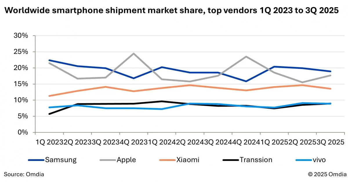 در مورد شیائومی، فروش در بازار چین پس از پایان برنامههای یارانهای دولت کاهش یافت، اما رشد در مناطق آسیای شرقی و سایر بازارها این افت را جبران کرد. شرکت vivo نیز جایگاه قدرتمند خود را در هند حفظ کرده، موفق شده در چین از هوآوی پیشی بگیرد و در مناطق آسیا-اقیانوسیه، آفریقا و آمریکای لاتین به رشد خود ادامه دهد.