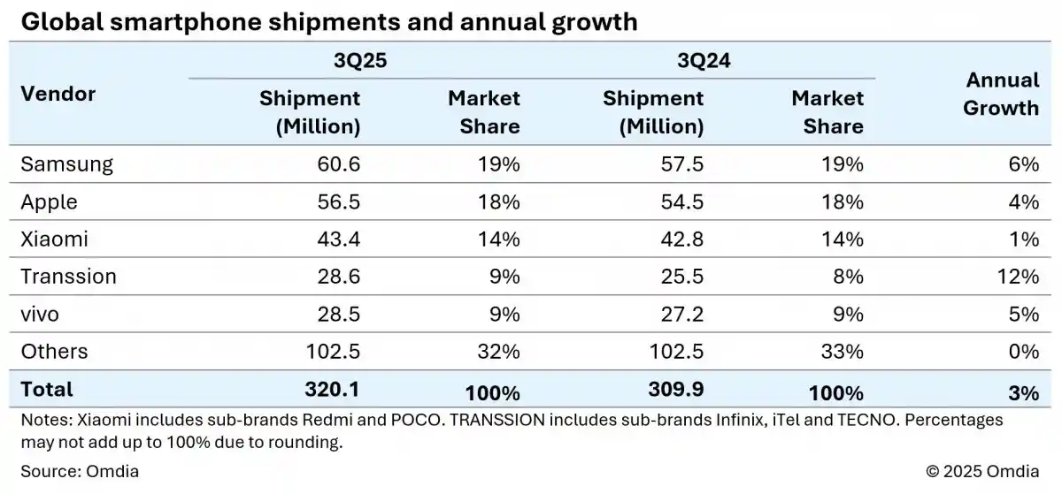 در مجموع، بازار جهانی در سهماهه سوم، ۳۲۰.۱ میلیون دستگاه عرضه کرده که نشاندهنده رشد ۳ درصدی سالانه است. فروش در آمریکای شمالی و چین بزرگ کاهش یافته، در حالی که مناطق آسیا-اقیانوسیه، خاورمیانه و آفریقا رشد قدرتمندی را ثبت کردهاند.