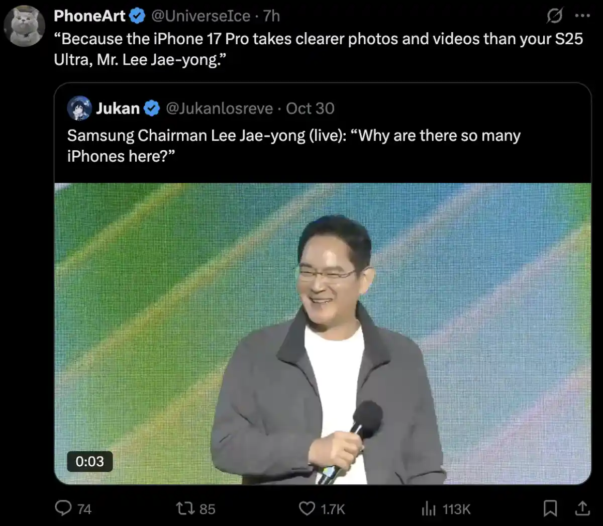 «چون آیفون ۱۷ پرو عکسها و ویدیوهای واضحتری نسبت به S25 Ultra شما میگیرد، آقای لی جائه-یونگ.»