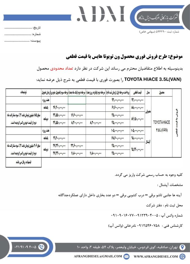 قیمت قطعی تویوتا هایس برای تیپ معمولی ۸.۸ میلیارد تومان و آپشنال ۹.۸ میلیارد تومان است. شرایط پرداخت یکماهه و دوماهه با سود مشارکت در ماه دوم (برای طرح دوماهه) فراهم است. واریز به حساب رسمی افرنگ دیزل ماندگار و صدور قرارداد الزامی است.