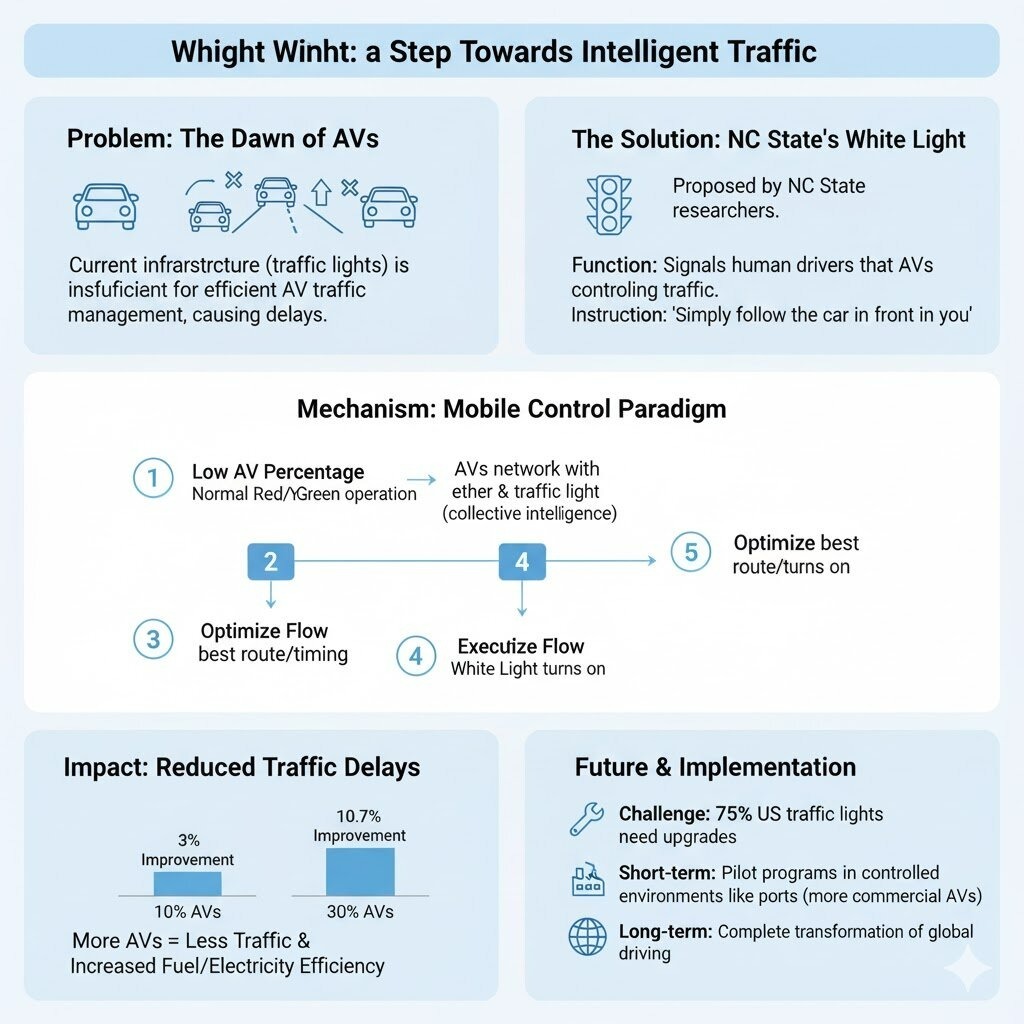 در این شرایط، یک تیم تحقیقاتی از مهندسان حملونقل دانشگاه کارولینای شمالی، برای بهرهگیری از قابلیت حیرتانگیز شبکهسازی خودروهای خودران، پیشنهاد جالب و متفاوتی را ارائه داده؛ چهار رنگه کردن چراغ راهنمایی و افزودن چراغ سفیدرنگ که وظیفه این چراغ جدید، هشدار دادن به رانندههای انسان برای “پیروی از خودروی جلویی” است.