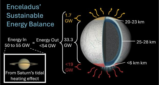 با احتساب حرارت از دست‌رفته قبلی از قطب جنوب فعال انسلادوس، کل اتلاف حرارت این قمر یخی زحل به ۵۴ گیگاوات می‌رسد. این رقم دقیقاً با ورودی حرارتی پیش‌بینی‌شده از نیروهای جزر و مدی منطبق است. این تعادل میان تولید و اتلاف حرارت به شدت نشان می‌دهد که اقیانوس انسلادوس می‌تواند در مقیاس‌های زمانی زمین‌شناختی به صورت مایع باقی بماند و محیطی پایدار برای پیدایش حیات فراهم آورد.