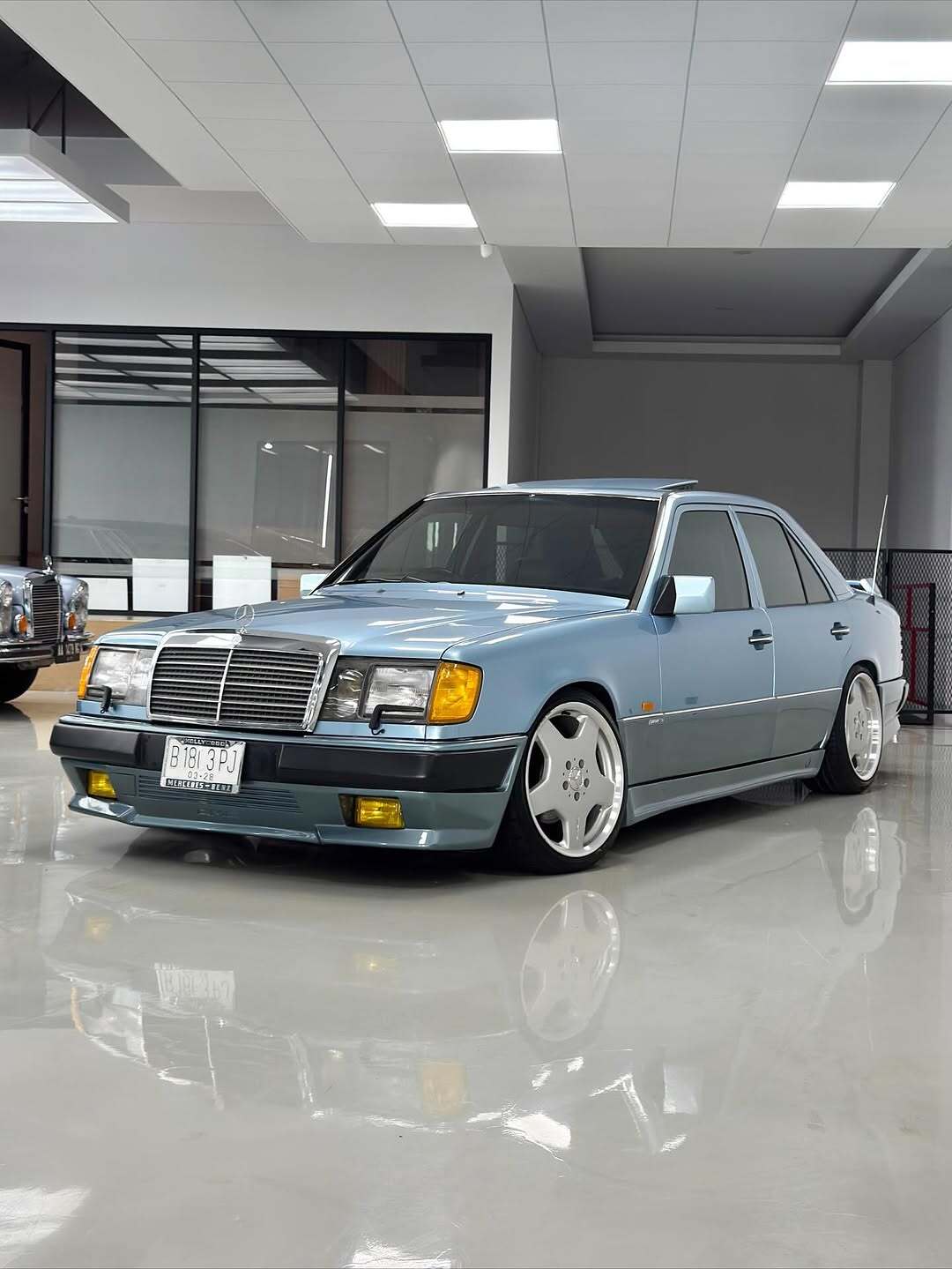 تصویری از نمای خارجی مرسدس بنز ۳۰۰E اسپورت‌لاین ۲۴V مدل ۱۹۹۱ به رنگ آبی، که با کیت بدنه و رینگ‌های ۱۸ اینچی اصلی AMG و سیستم تعلیق بادی عرضه شده و تنها ۱۰۷,۰۰۰ کیلومتر کارکرد دارد.