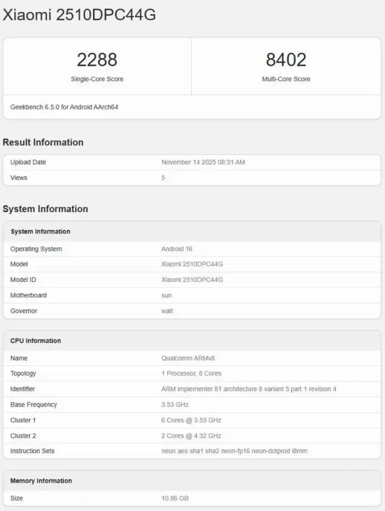 - 🔵 تأیید پردازنده: حضور در گیکبنچ تأیید کرد که پوکو F8 پرو از تراشه اسنپدراگون ۸ الیت (Snapdragon 8 Elite) قدرت میگیرد.