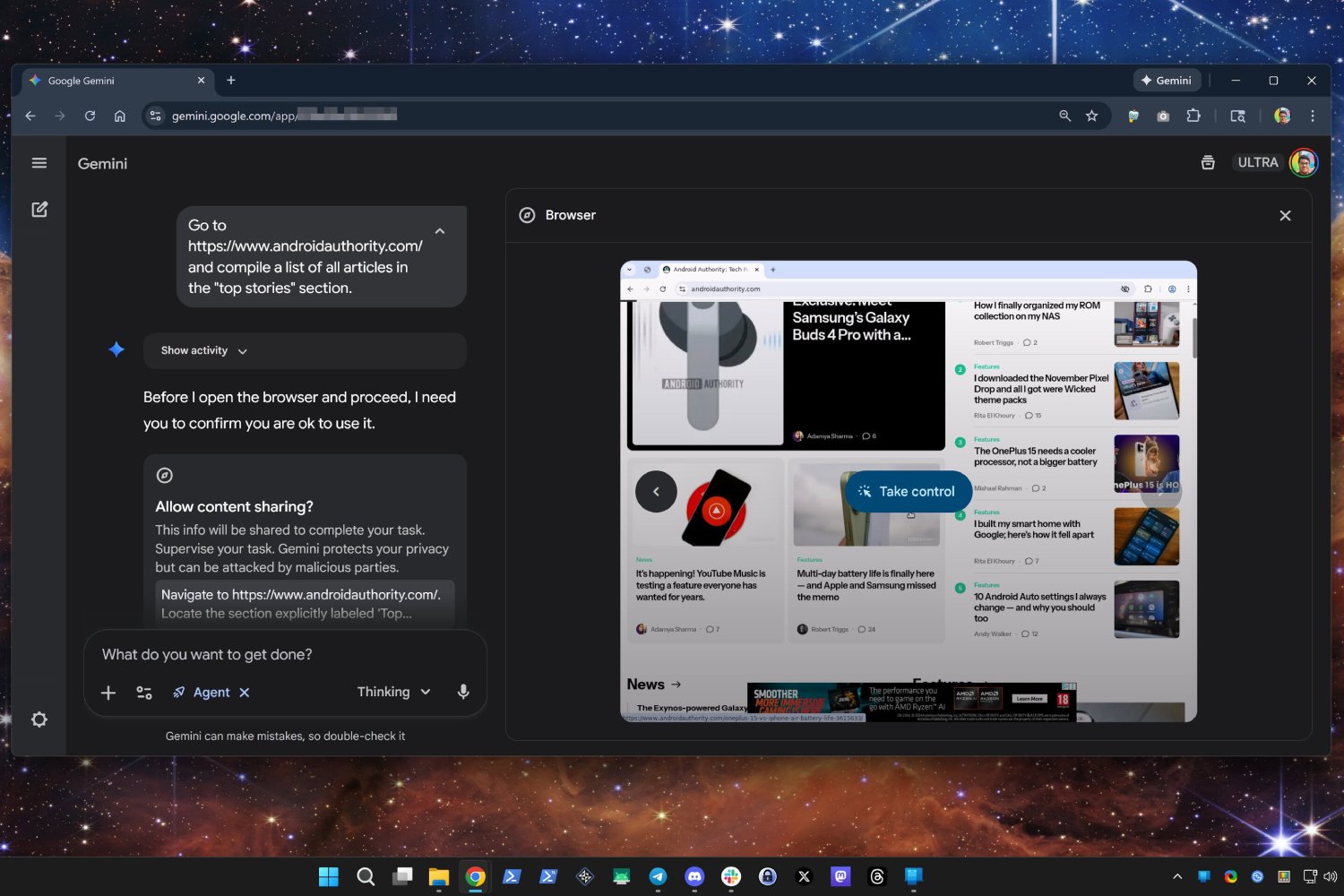 بسته به نوع وظیفه، امکان دارد جمنای ایجنت برای تکمیل کار، مرورگر وب مستقل باز کند. اگر این نیاز وجود داشته باشد، جمنای از شما میخواهد که اشتراکگذاری محتوا را مجاز کنید. سپس پنجرهی جدید باز و نسخهی جدید از کروم را در آن بارگذاری میکند. پس از آن، بهطور خودکار اسکرول و روی لینکها کلیک میکند تا کار محولشده تکمیل شود. در هر زمان میتوانید روی پنل مرورگر نگهدارید، گزینهی Take control را انتخاب و آن را بهصورت دستی هدایت کنید.