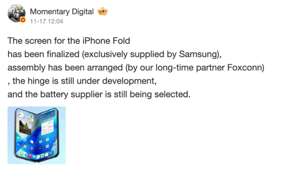 • 🔵 نمایشگر انحصاراً از سامسونگ: سامسونگ به عنوان تنها تامین‌کننده نمایشگرهای آیفون فولد انتخاب شده و ال‌جی و BOE نقشی نخواهند داشت.