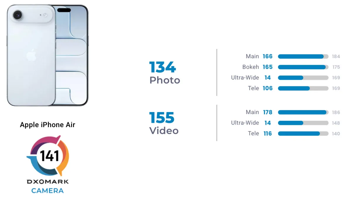این درحالی است که گوشیهایی مانند موتورولا اج ۷۰ نشان میدهند که میتوان سه دوربین پشتی را در یک قاب ۵.۹۹ میلیمتری جای داد. در تحلیل دقیق دوربین DxOMark، جای تعجب نیست که فقدان دوربینهای اختصاصی منجر به کسر امتیاز شدید شده است، زیرا زوم دیجیتال و حالتهای پانوراما نمیتوانند جایگزین یک دوربین فوقعریض و تلهفوتوی اختصاصی شوند. آیفون ایر با کسب ۱۴۱ امتیاز، تنها در رتبه ۴۱ام بهترینها قرار میگیرد و پشت سر گوشیهایی مانند گوگل پیکسل ۸، آیفون ۱۵ و شیائومی ۱۵ و همرده گوشیهای پرچمدار سال ۲۰۲۱ اپل و شیائومی یعنی سری آیفون ۱۳ پرو و شیائومی می ۱۱ اولترا جای میگیرد.