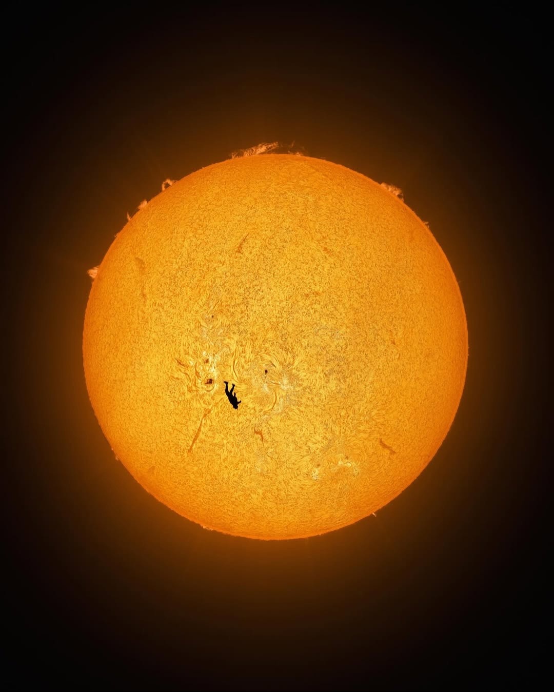 ترکیب نهایی یک اثر هنری–علمی است: نمایی انسانی (چترباز) روی پس‌ زمینه‌ ای کیهانی (سطح خورشید) که نتیجه ماه‌ ها برنامه‌ ریزی، محاسبه و تمرین است.