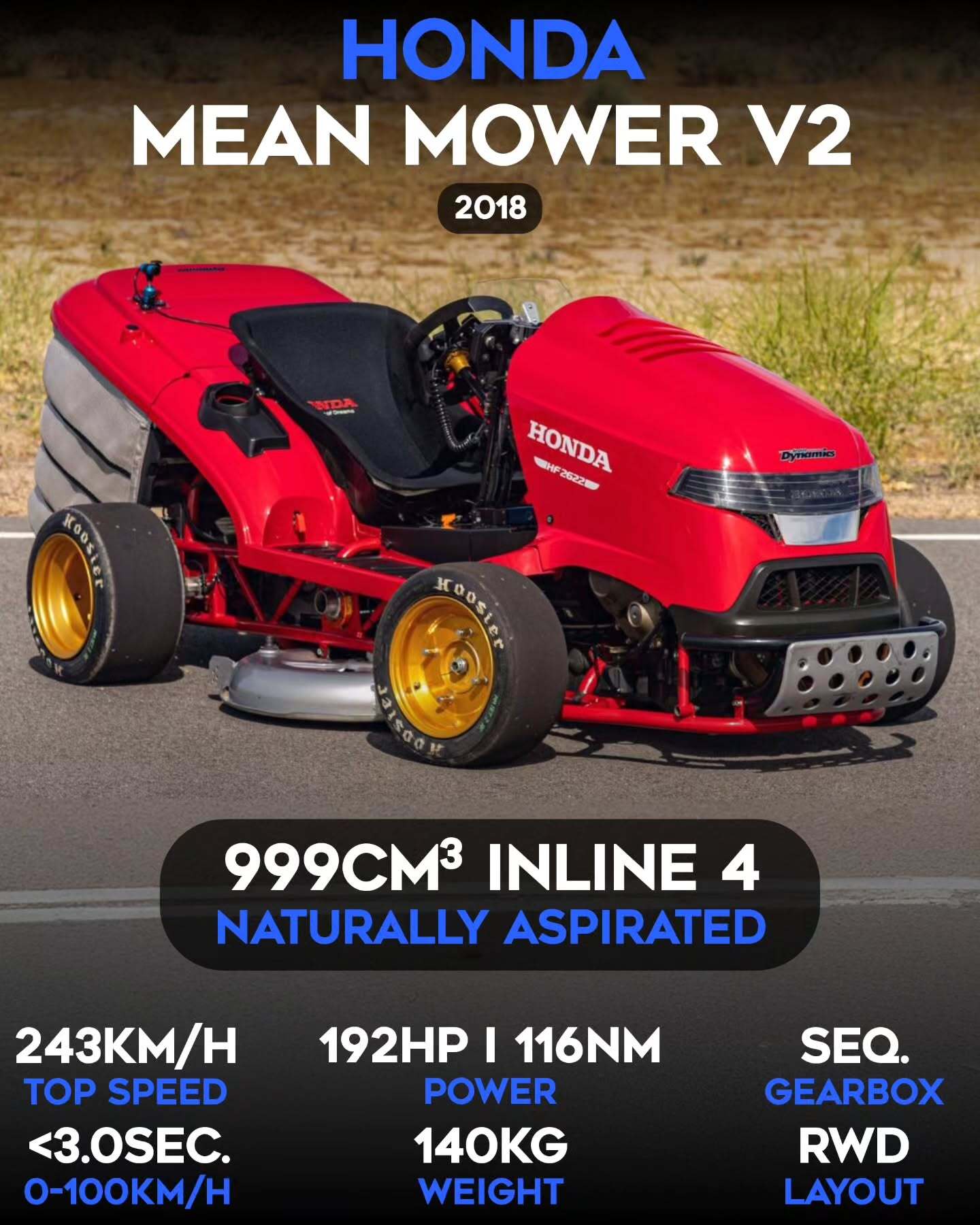 این چمنزن از یک موتور چهار سیلندر خطی ۹۹۹ سیسی متعلق به موتور سیکلت هوندا CBR1000RR Fireblade استفاده میکند که قدرتی در حدود ۲۰۰ اسب بخار تولید میکند. این وسیله با وزنی کمی بیش از ۱۴۰ کیلوگرم و مجهز به یک گیربکس شش سرعته ترتیبی، قادر است در کمتر از ۳ ثانیه از صفر به ۱۰۰ کیلومتر بر ساعت برسد و حداکثر سرعت تأیید شده آن بیش از ۲۴۰ کیلومتر بر ساعت است.
