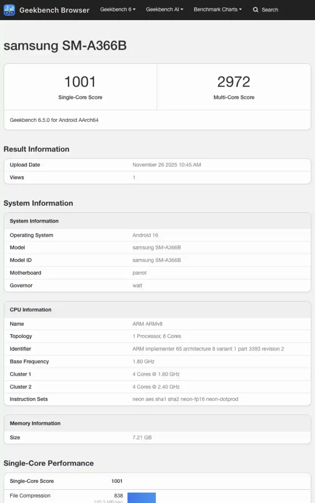 برای مقایسه، گلکسی A36 در تستهای مشابه امتیازهای حدودی ۱,۰۰۰ (تکهستهای) و ۲,۹۰۰ (چندهستهای) را ثبت کرده بود. این ارقام نشان میدهند که دستگاه جدید حدود ۱۵ درصد سریعتر از مدل فعلی عمل خواهد کرد که پیشرفت قابل قبولی محسوب میشود.