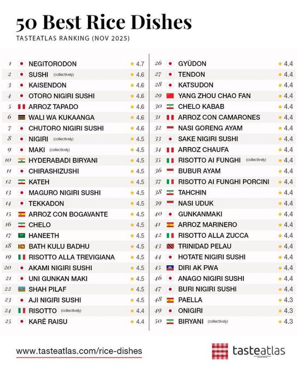 فهرست «پنجاه غذای برتر بر پایه برنج» توسط وبسایت معتبر TasteAtlas، نشان میدهد برنج چگونه در فرهنگهای مختلف به شاهکارهای آشپزی تبدیل شده است. این لیست نهتنها رقابت میان کشورها را برجسته میسازد، بلکه نشان میدهد غذاها چگونه سفیران فرهنگی ملتها هستند. البته که ایران هم در آن حضور دارد.