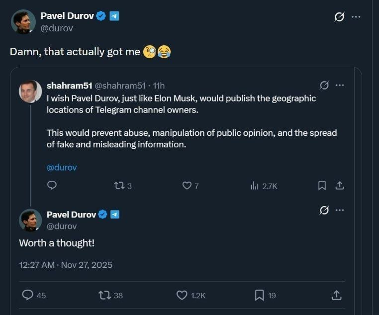 ماجرا از جایی آغاز شد که یک کاربر ایرانی در توییتر از مدیرعامل تلگرام پرسید آیا این پلتفرم هم قصد دارد قابلیتی مشابه ایکس برای نمایش موقعیت مکانی کاربران راه‌اندازی کند یا خیر. کمی بعد، حسابی با نام پاول دوروف به این پرسش پاسخ داد و نوشت: «ایده خوبیه، فکر می‌کنم بهش». این پاسخ به‌سرعت دست‌به‌دست شد و شایعه‌ای شکل گرفت که تلگرام در حال بررسی چنین قابلیتی است.
