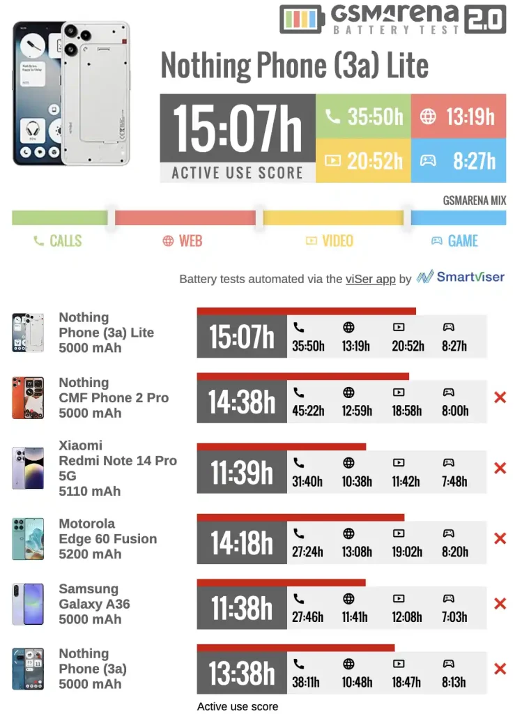 گوشی هوشمند Nothing Phone (3a) Lite با یک باتری ۵۰۰۰ میلیآمپرساعتی وارد میدان شده است. نتایج تستهای تخصصی نشان میدهد که این گوشی با کسب امتیاز «استفاده فعال» ۱۵ ساعته، عملکردی بسیار قابلاطمینان و مطلوب از خود به نمایش گذاشته است.