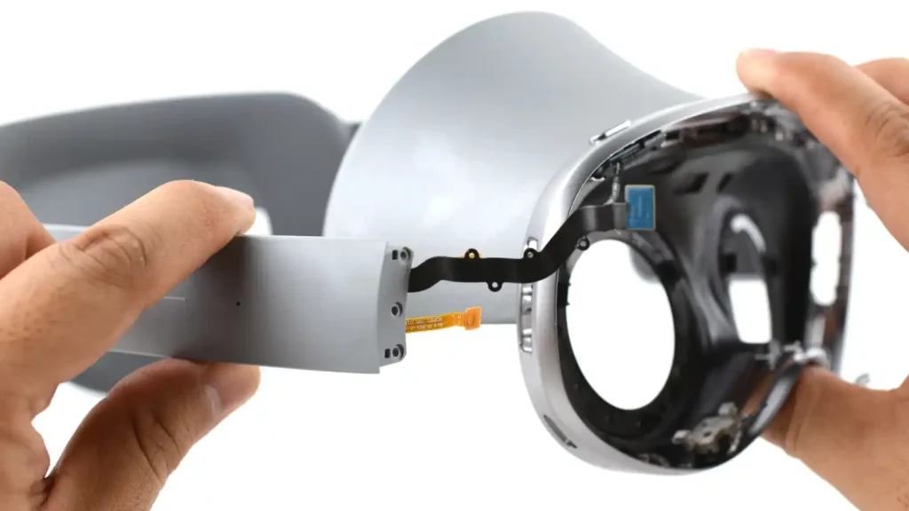 هدست گلکسی XR از رقیب خود یعنی ویژن پرو اپل سبکتر است و از بالشتکهای صورت و محافظهای نور مغناطیسی بهره میبرد. فرآیند کالبدشکافی از جلوی دستگاه آغاز میشود، بنابراین ابتدا باید پوسته پلاستیکی جلویی جدا شود که این کار بهراحتی امکانپذیر نیست.