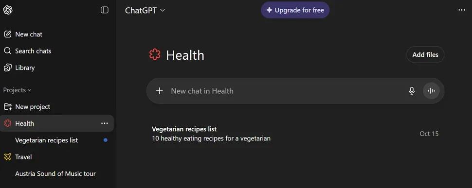 راهاندازی Projects ساده است: به بخش سمت چپ ChatGPT میروید، روی “Projects” کلیک میکنید و سپس با دکمه “+ New Project” پروژه جدیدی ایجاد میکنید. برای مثال، پروژههایی با عنوان Health و Travel ساخته و پس از افزودن یادداشتها و لینکهای مرجع، ChatGPT به طور خودکار همه اطلاعات مرتبط را در محیط پروژه متصل میکند.